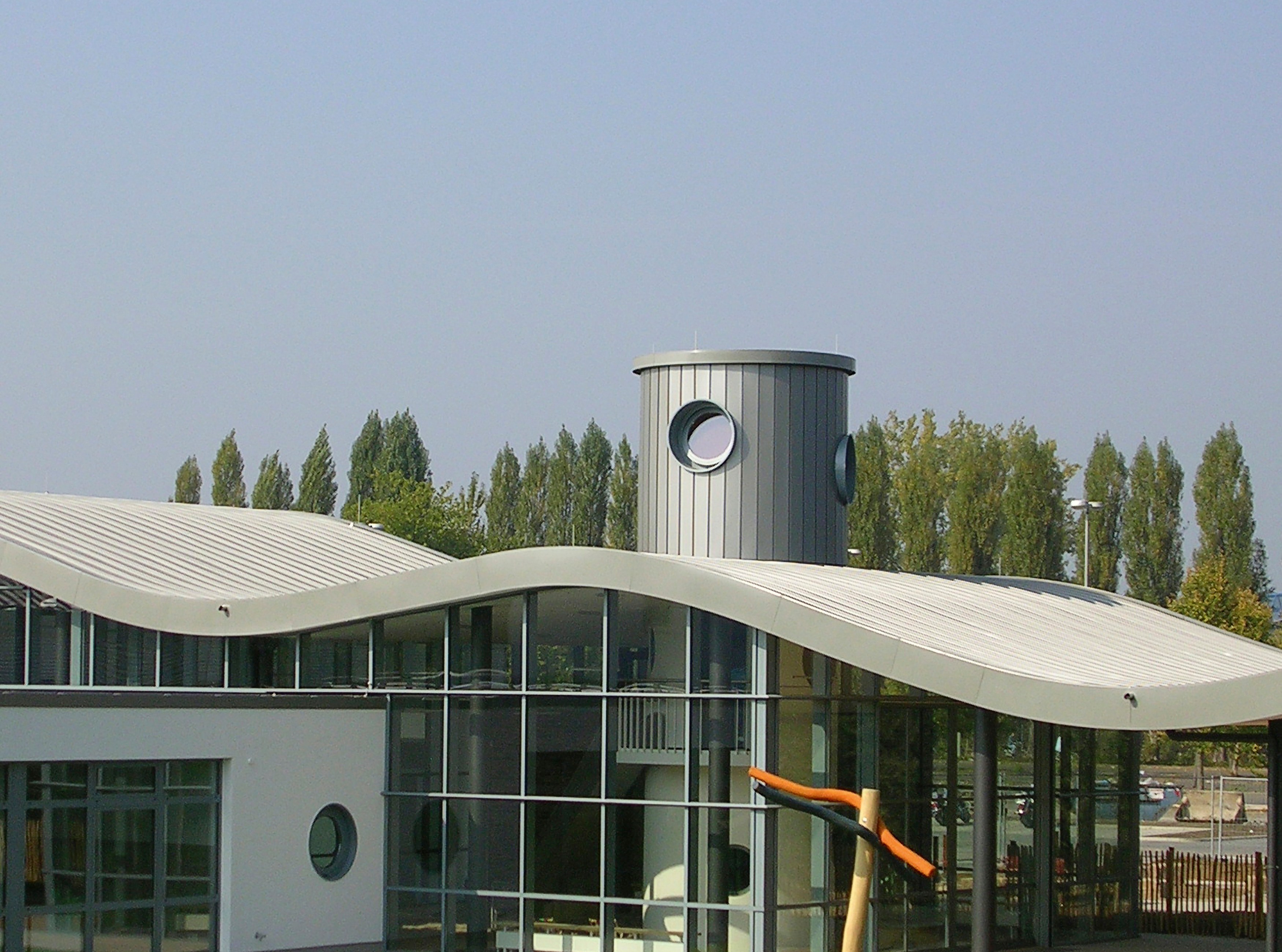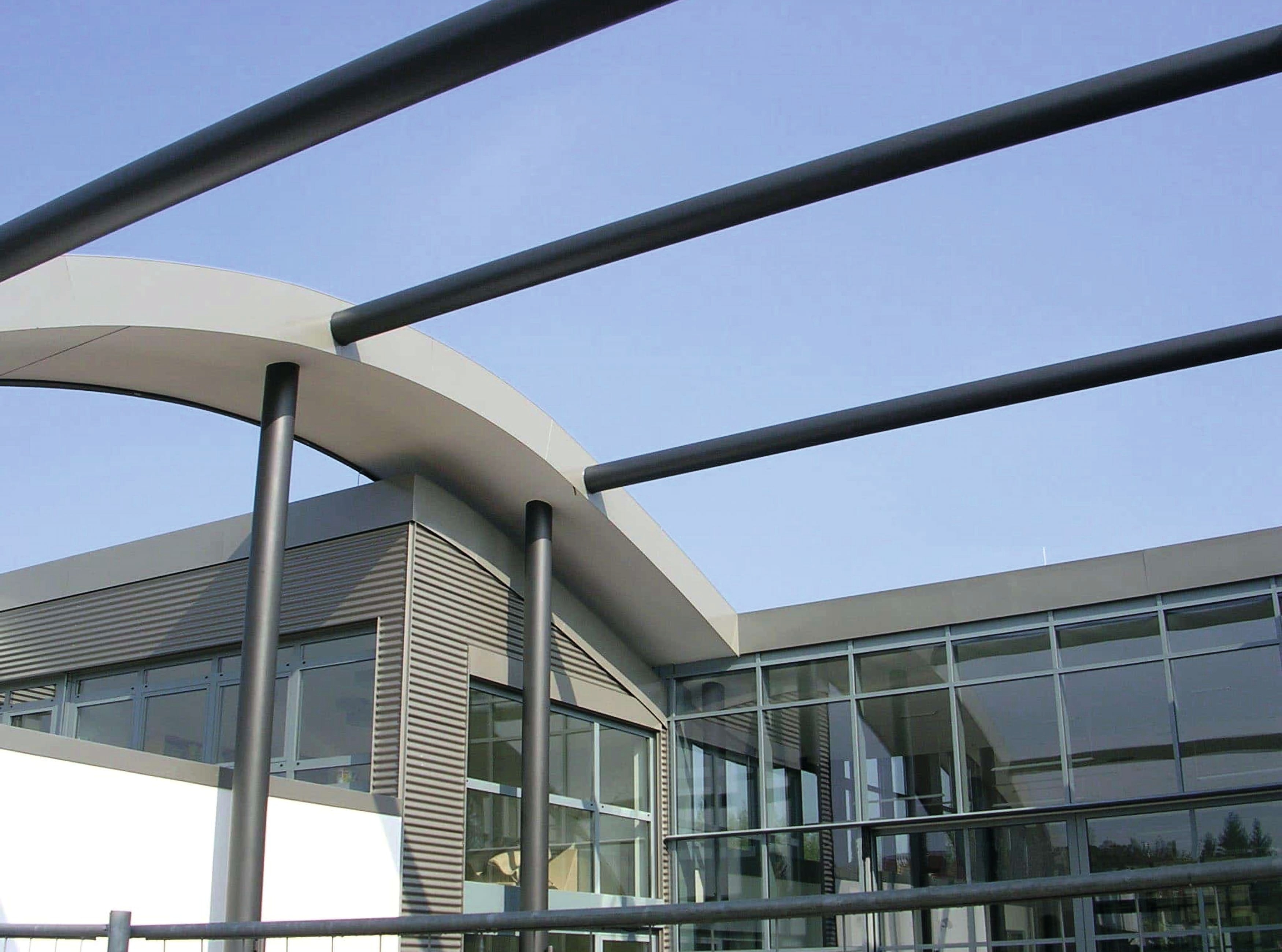 Details: Fertigung der wellenförmigen Ortgangblenden gemäß Dachverlauf sowie runder Mauerabdeckungen am Turm und runder, in die Metallfassade integrierter Fenstereinfassungen.